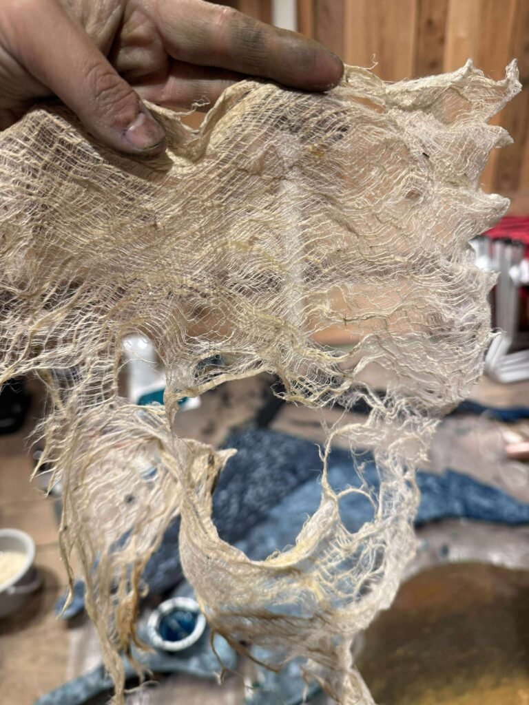 東山和紙の工房でいただいた楮の繊維を広げてパネルに貼り、テクスチャを作っていく。