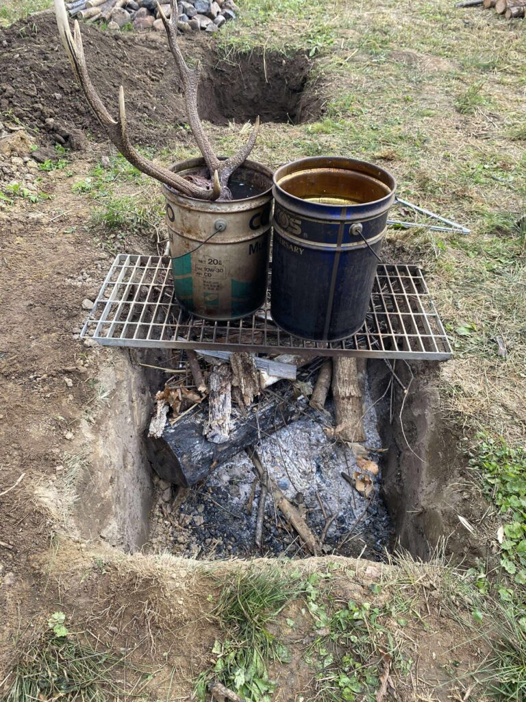 毛皮と頭部を火にかけて膠となるコラーゲンを煮出す。丸缶からはみ出る立派なツノ。あまり見ない光景。