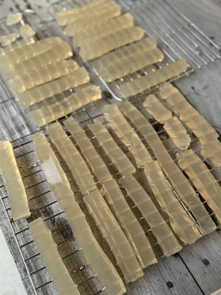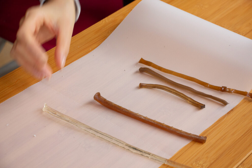 乾燥したものはこんな見た目になる。右奥から鹿膠、熊膠、魚膠。