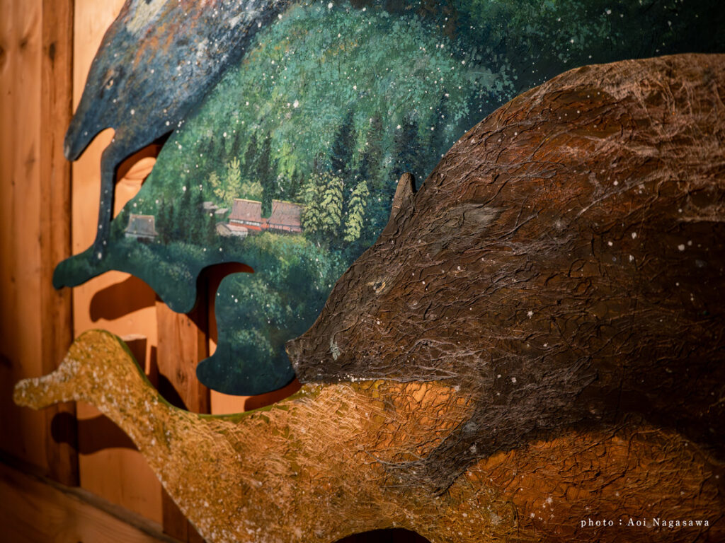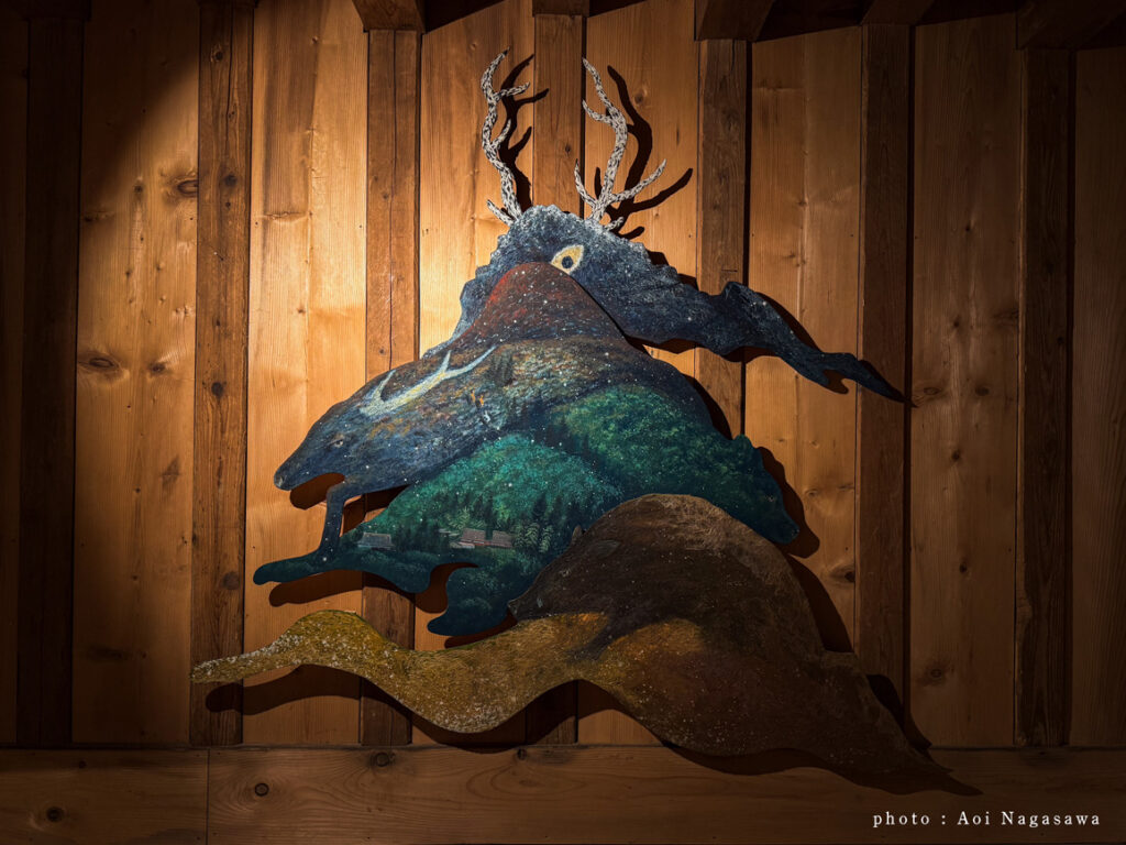 こうした体験から、今回初めてキャンバスを半立体的に切り出し、狩猟で得た鹿皮から抽出した膠、解きほぐした和紙・楮繊維、動物の血を原料としたプルシアンブルー、藍染めなどを画面に用いました。造形や素材、人々の足跡と感じ取ったシシの魂の気配ごとを語り繋ぐ箱舟として、「野を抱く」を制作しました。