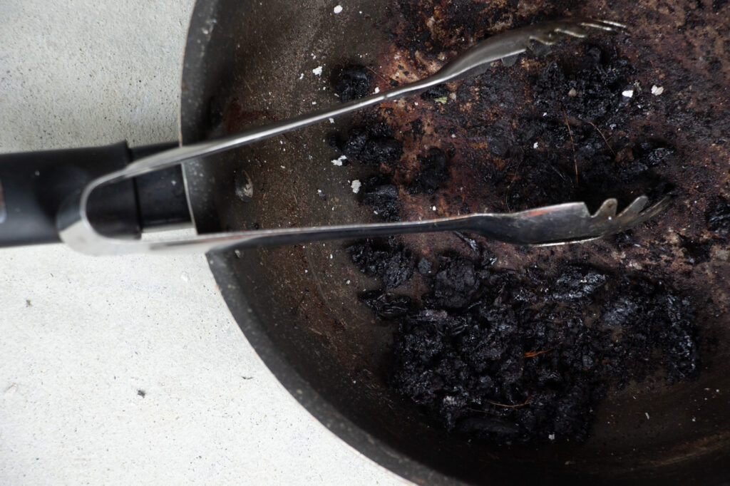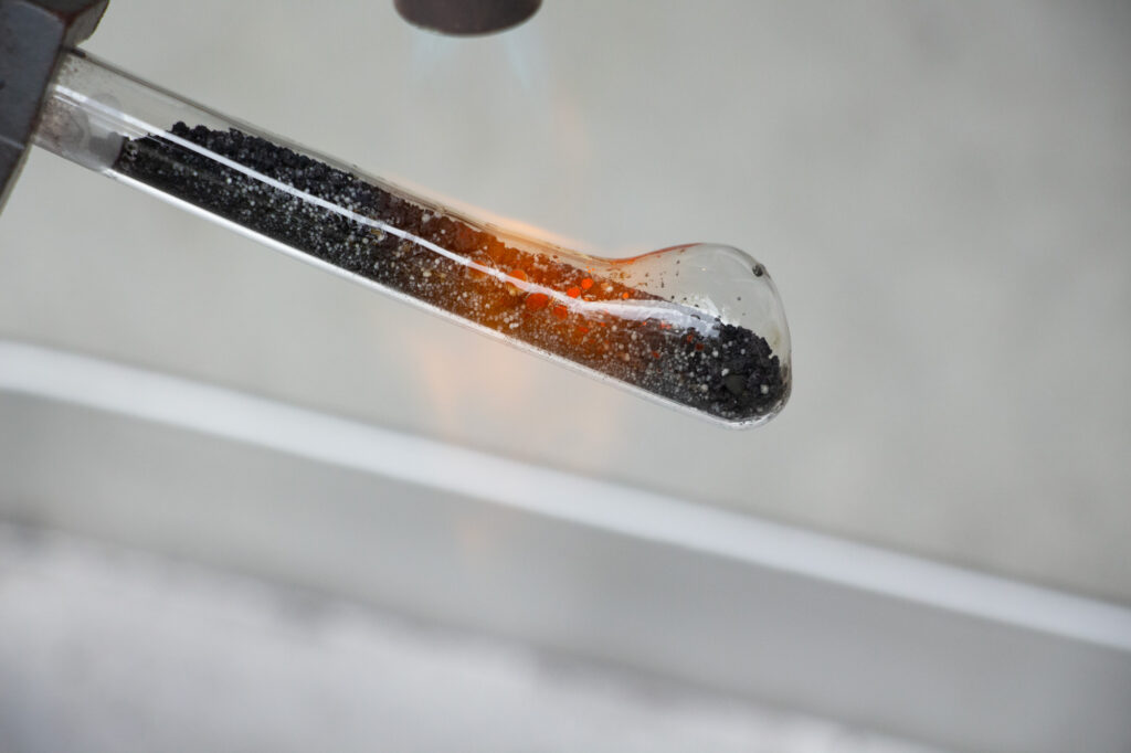 焼いた血にベンガラと炭酸カリウムを混ぜて加熱する。熱された箇所が赤く光って、黒い炭になる。