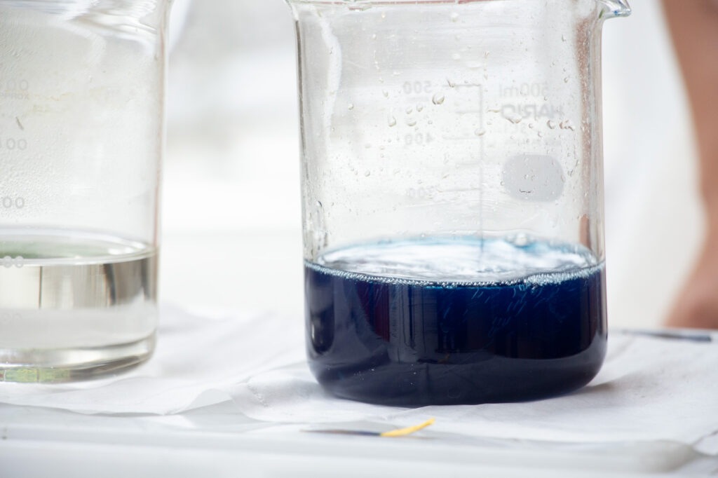 化学実験的で、魔術的な、不思議な工程を経て、赤みがかった鮮やかな青色ができた。
