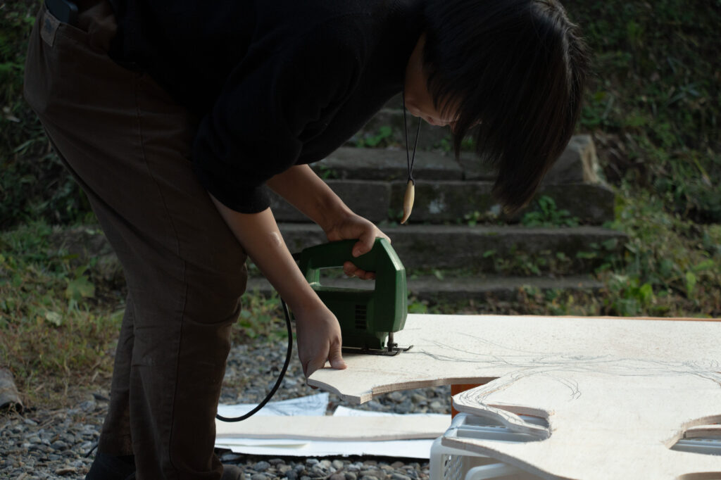 四角いパネルが一般的だが、工具を使って自由な形にベニヤを切り抜いていく。